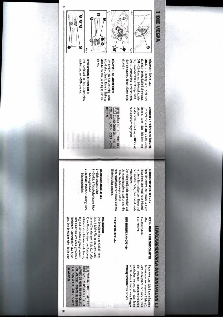 Piaggio-Logo abhebeln. Lenker nach links drehen und die zentrale Kreuzschlitzschraube lösen (neben der Einstellschraube für den Scheinwerfer). Dann von hintern die beiden Kreuzschlitzschrauben lösen und die Lenkerverkleidung nach vorne klappen. Vorsicht mit den Kabeln