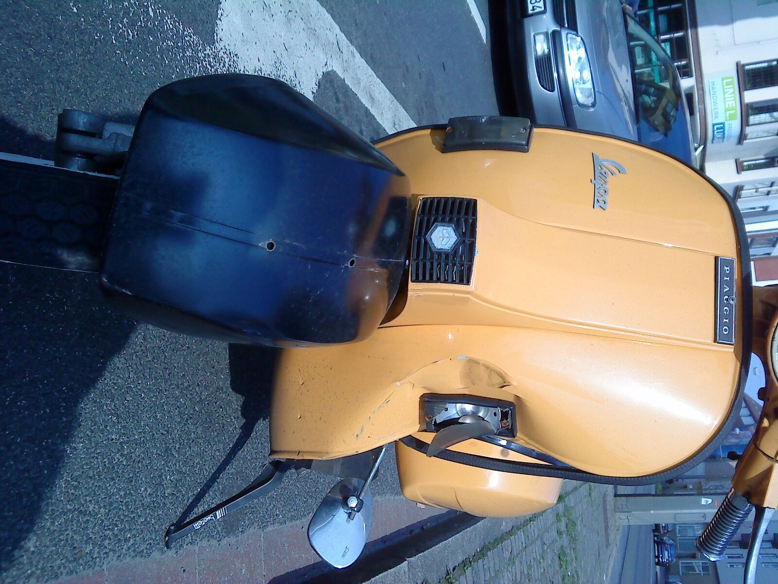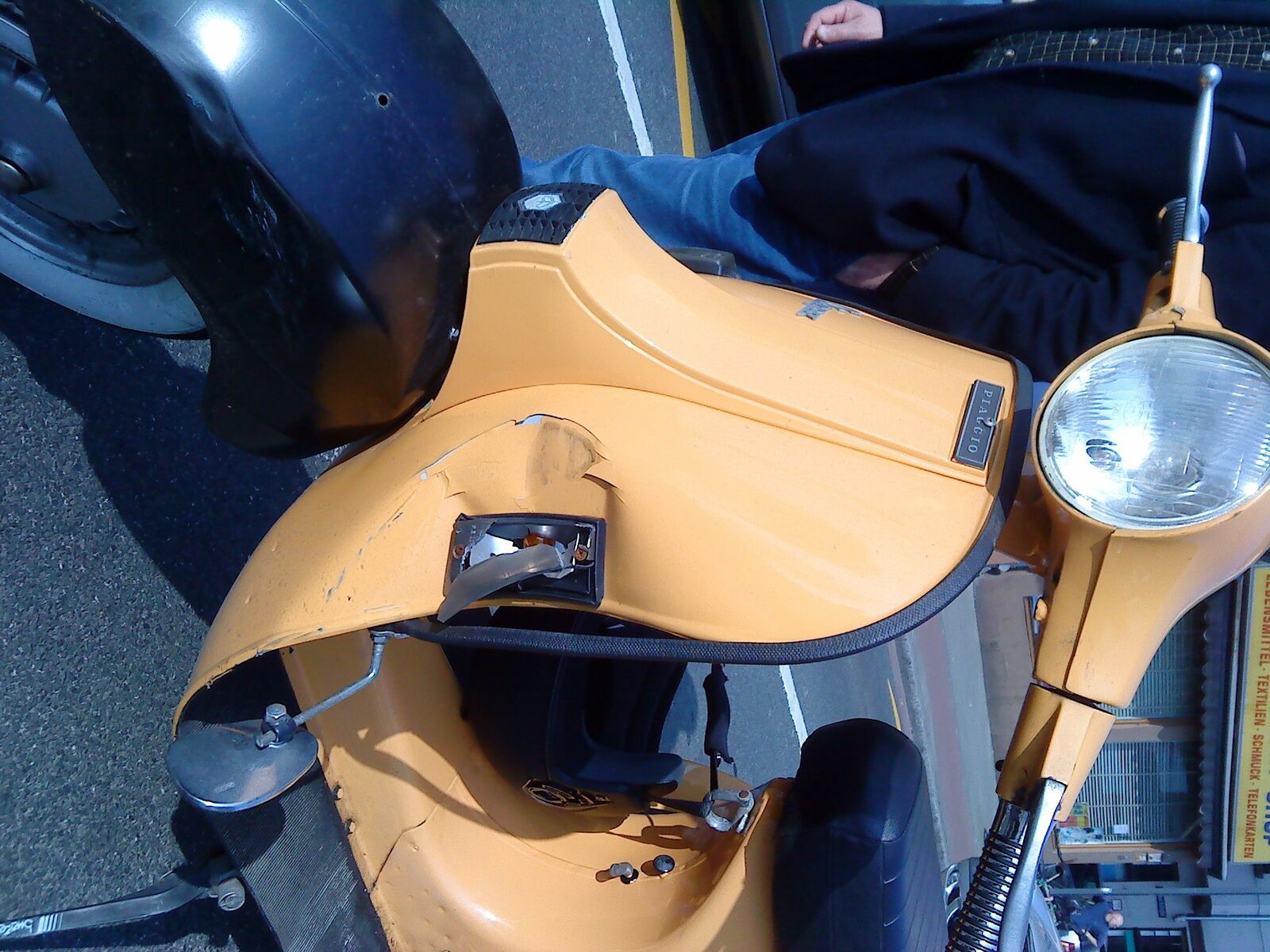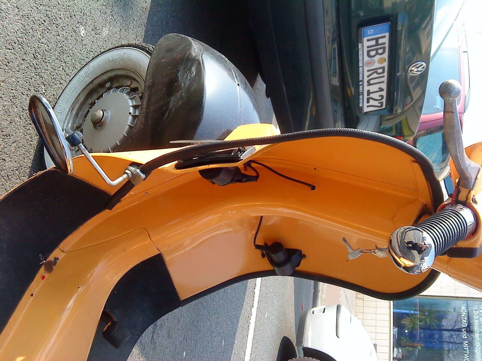 gekauft für 1050€. habe mich mit dem verkäufer knapp ne stunde unterhalten und wir haben über die vorgeschichte der vespa gesprochen: ez 1981 (also in 3 jahren ein oldtimer), 2 vorbesitzer, wobei die dame, die den roller zuletzt gefahren hat nur 1 monat damit gefahren ist und ihn wieder an den 1. besitzer zurück gegeben hat, weil sie mit der schaltung nicht klar kam. die lackierung ist schon älter, sollte also kein versuch sein kurzfristig schönheitskosmetik zu betreiben. hier und da ein paar macken im lack, aber nichts gravierendes, habe eh vor die gute komplett schwarz lackieren zu lassen. ansonsten gabs dazu noch ein reserverad, eine mobile garage, einen messbecher zwecks ölzufüllung beim tanken (welches öl braucht man?), ein handschuhfach und eine 2. sitzbank.